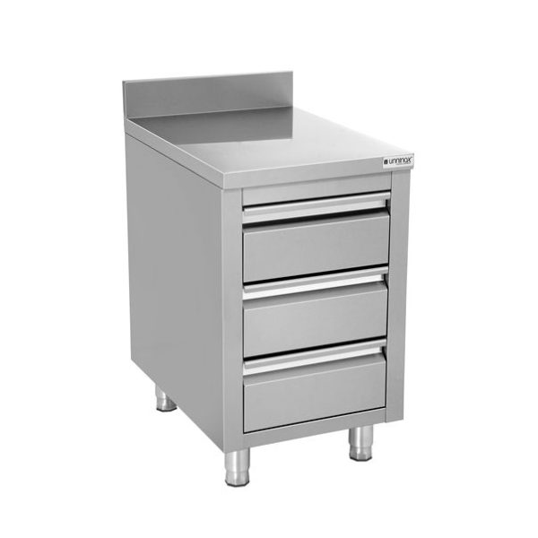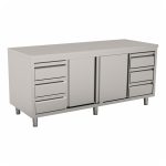 Visokokvalitetni radni stol izrađen od AISI Inox nehrđajučeg čelika ima čvrstu radnu ploču od nehrđajućeg čelika koja je ojačana s dva mosta i ima nosivost od 150-200 kg.