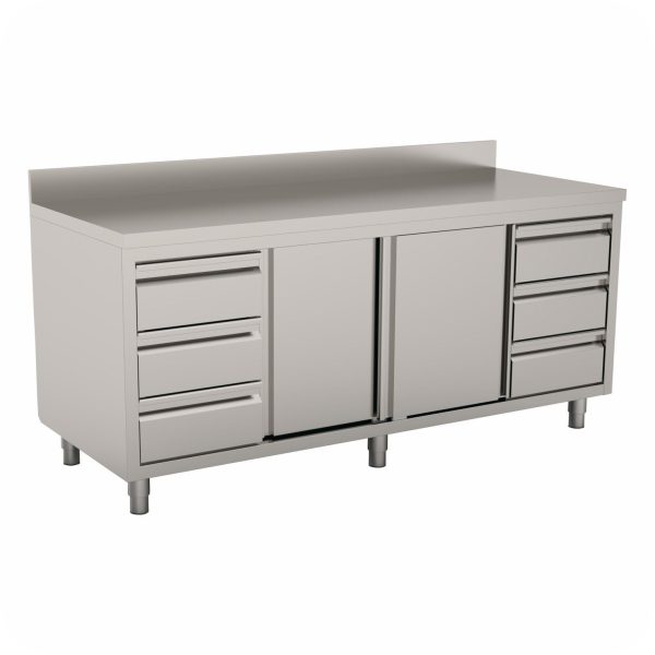 Visokokvalitetni Pult izrađen od AISI Inox nehrđajučeg čelika ima čvrstu radnu ploču od nehrđajućeg čelika koja je ojačana s dva mosta i ima nosivost od 150-200 kg.